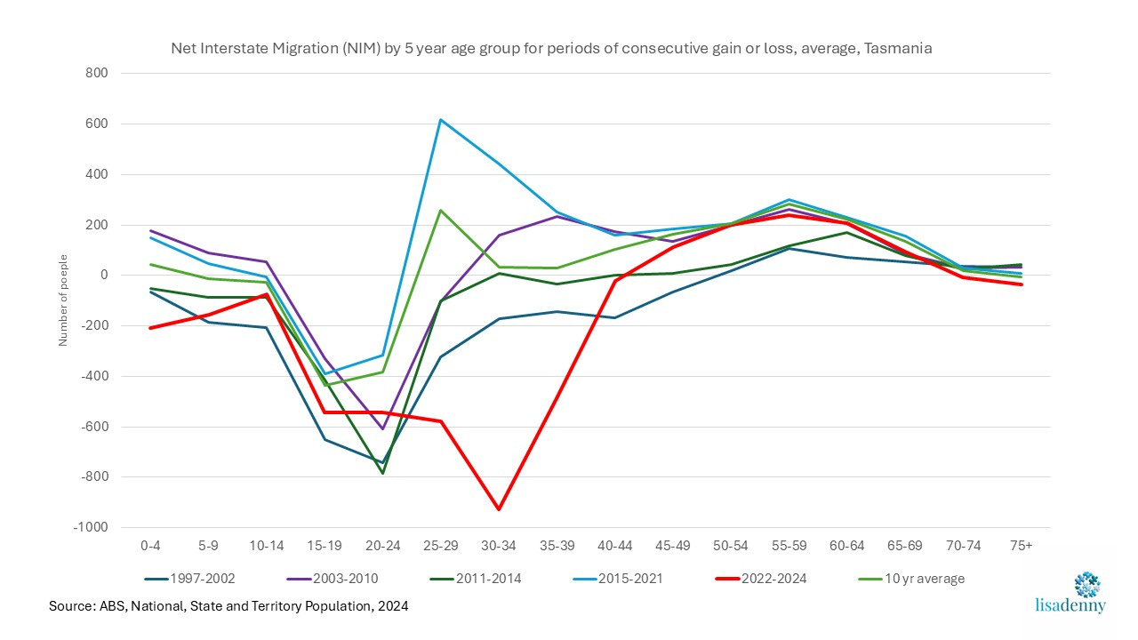 For the current consecutive period from 2022 to 2024, all age groups from 0-4 to 40-44 years and 70-74 and 75+ recorded an average net interstate loss (as per the thicker red line in the below chart) while the age groups 45-49 to 65-69 years recorded net interstate gains. This has the effect of increasing Tasmania’s rate of population ageing – effectively making Tasmania’s population older, faster. Additionally, the significantly larger loss of 30- to 34-year-olds – the age range at which most women have their first child – impact on future demographic reproduction, further contributing to Tasmania’s rate of ageing and making Tasmania’s age structure even more top heavy as there are less women of reproductive age residing in Tasmania (I published about this in the international Journal of Population Research here).