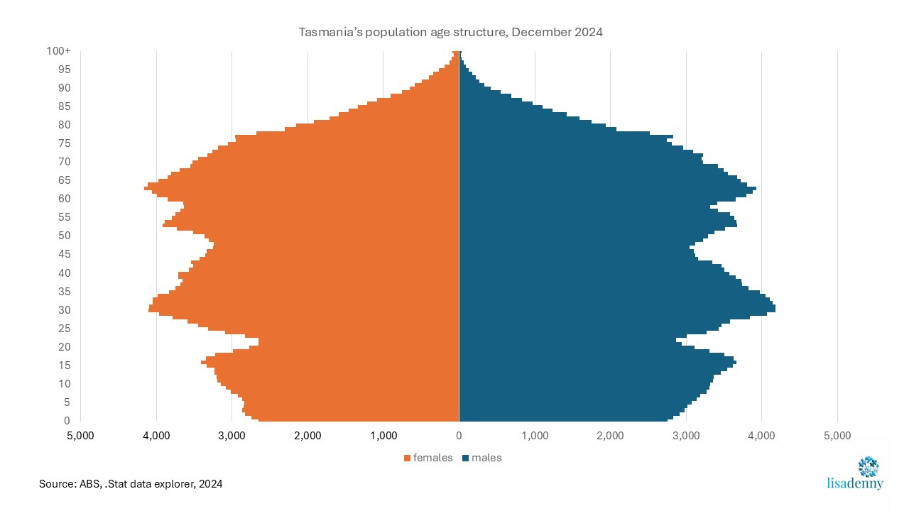 While the public discourse around Tasmania’s population focusses on the number of people – i.e. the size and growth rate of the population, it is actually the shape of the population age structure – the composition of the population by age and sex - that determines the future demographic development (endogenous growth or decline) – the balance between old and young, births and deaths – of the state.