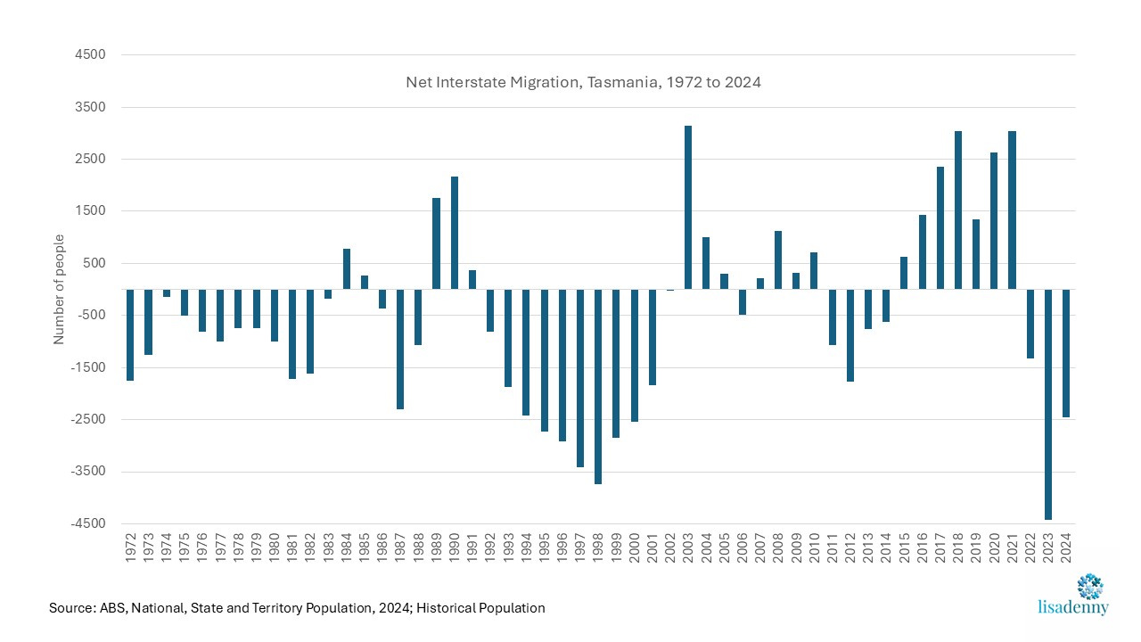 Did you know that since 1972 Tasmania has recorded five periods of consecutive annual net interstate migration gains with each period approximately 3.8 years in duration, while it has recorded five periods of consecutive net interstate migration annual losses with each period approximately 6.6 years in duration? The average annual loss per period was 1,654 people while the average annual gain per period was 1,220 people.