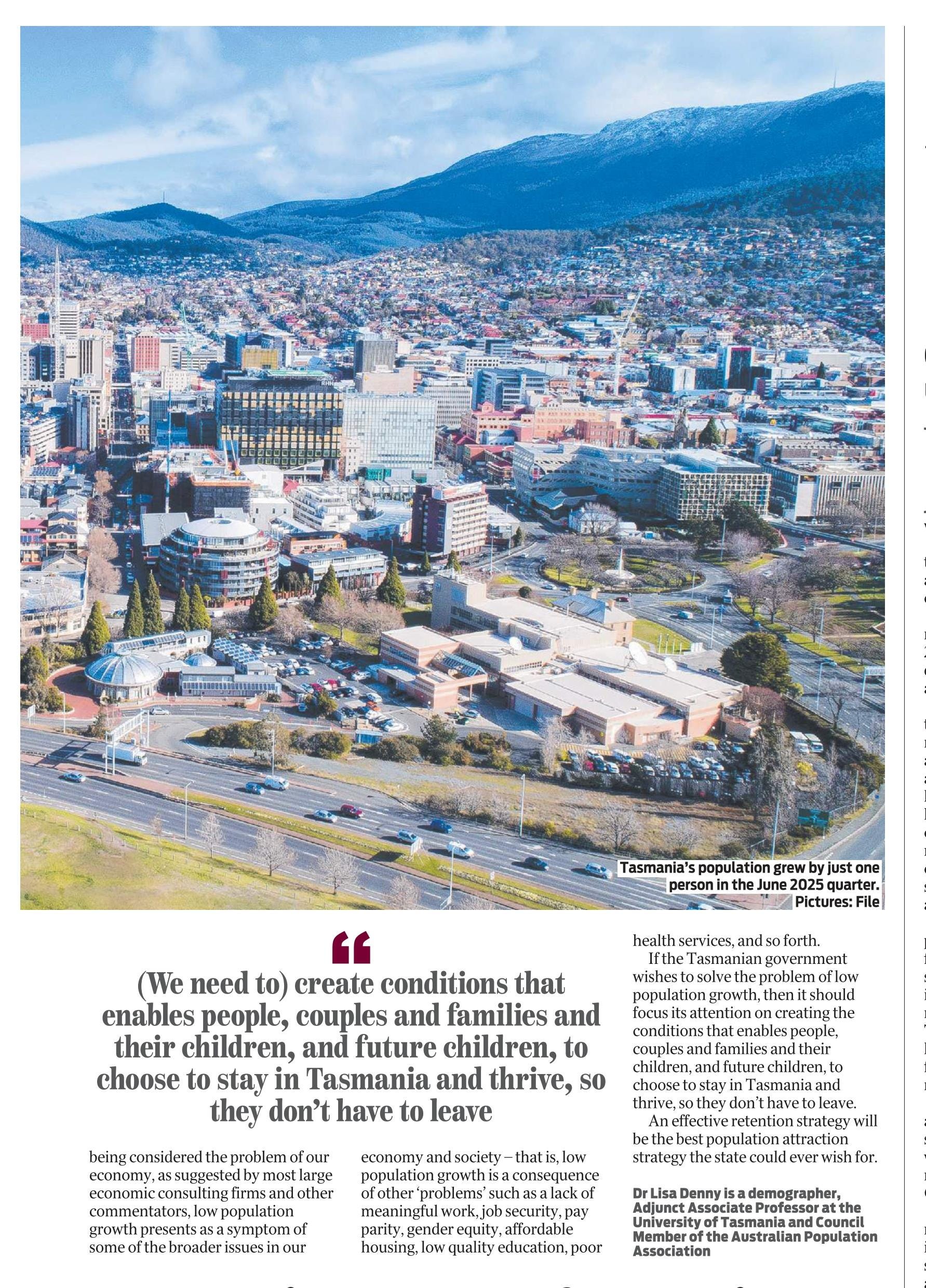 Dr Lisa Denny is a demographer, Adjunct Associate Professor at the University of Tasmania and Council Member of the Australian Population Association