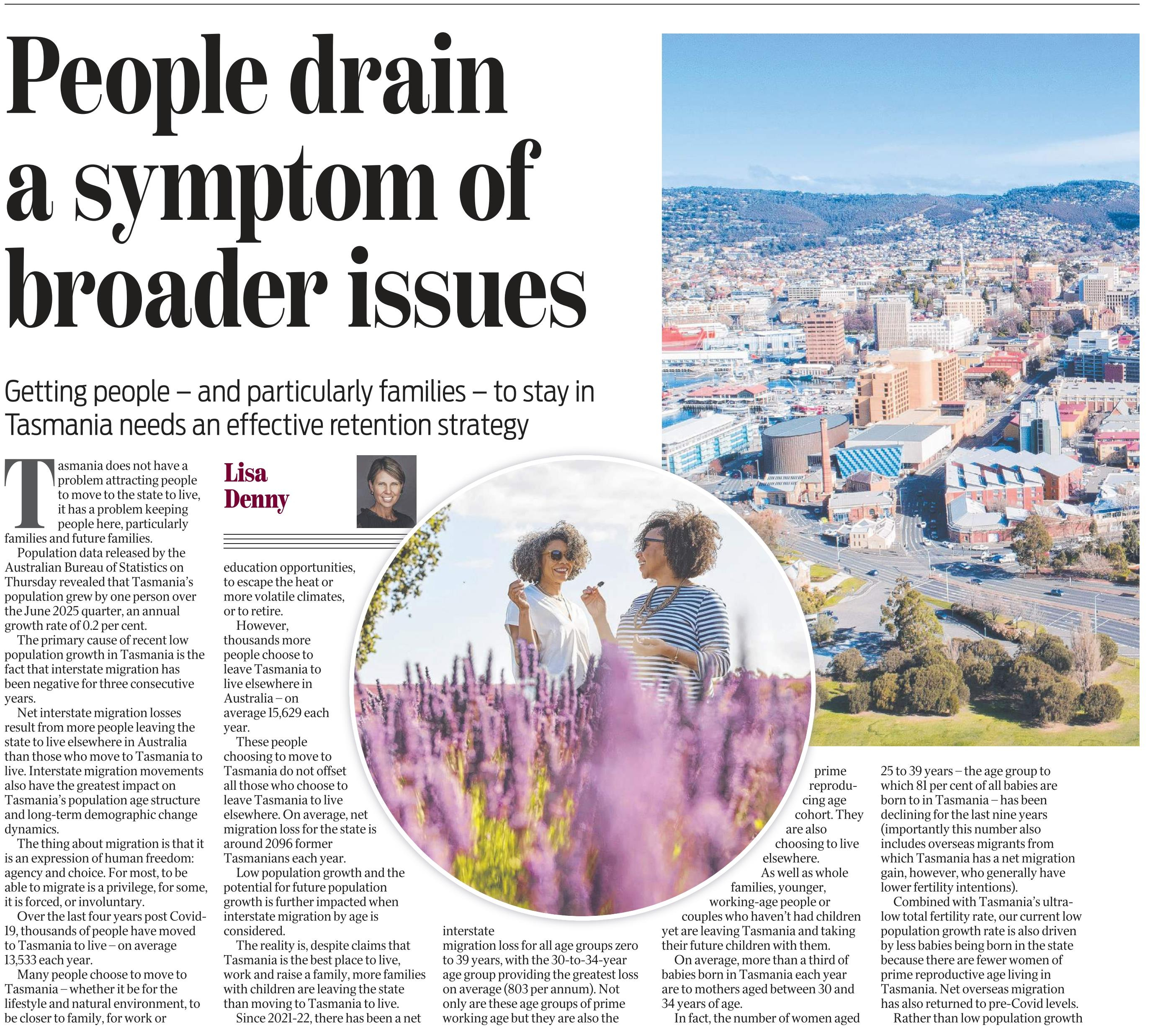 If the Tasmanian Government wishes to solve the problem of low population growth, then it should focus its attention on creating the conditions that enables people, couples and families and their children, and future children, to choose to stay in Tasmania and thrive, so they don’t have to leave.