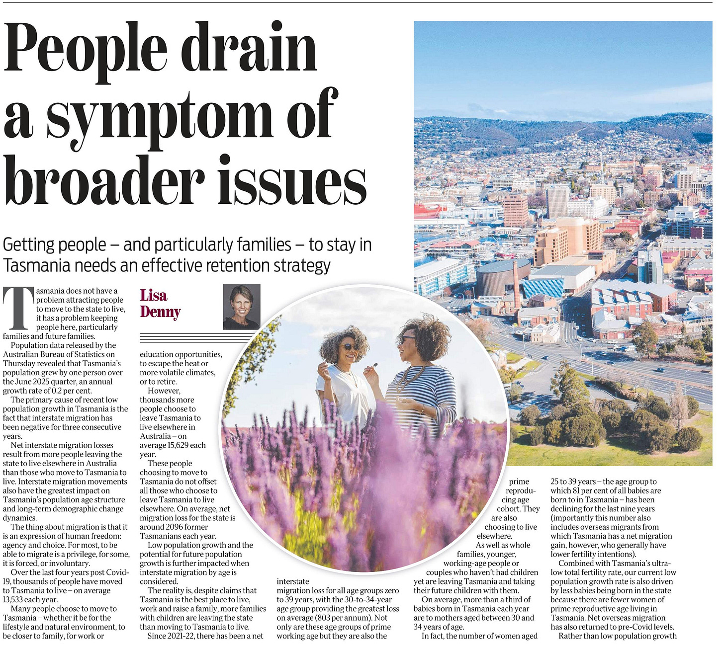 Tasmania does not have a problem attracting people to move to the state to live, it has a problem keeping people here, particularly families and future families.