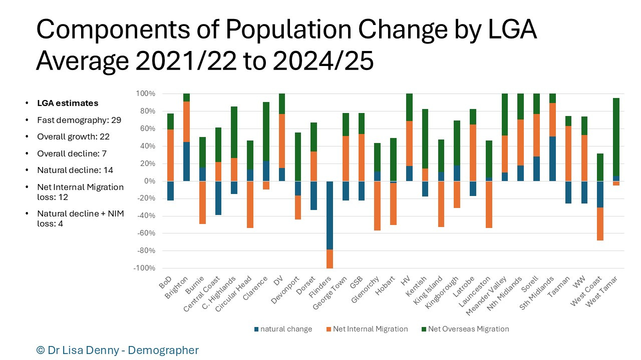 In Tasmania, on average over the past four years, all 29 LGAs experienced fast demography. For 22 LGAs, more than 75% of their population change was dominated by migration. For some, migration offset natural decline (more deaths than births). For seven, migration was not sufficient to offset natural decline.